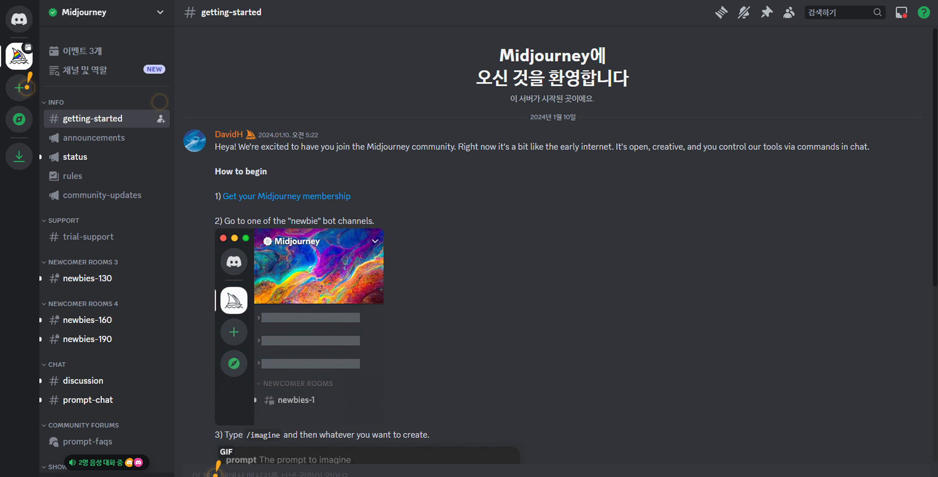 위 화면에서 가장 왼쪽 미드저니 아이콘을 클릭하면 나타나는 목록에서 INFO > '#getting-started' 메뉴를 클릭해주세요.