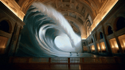 프롬프트 : 화려한 장식으로 유명한 문화유산 공간 속에서 거대한 파도가 높이 솟아올랐다가 부서지기 시작합니다. 순간을 포착한 두 명의 서퍼가 능숙하게 파도를 해쳐나갑니다. (OpenAI 제공)